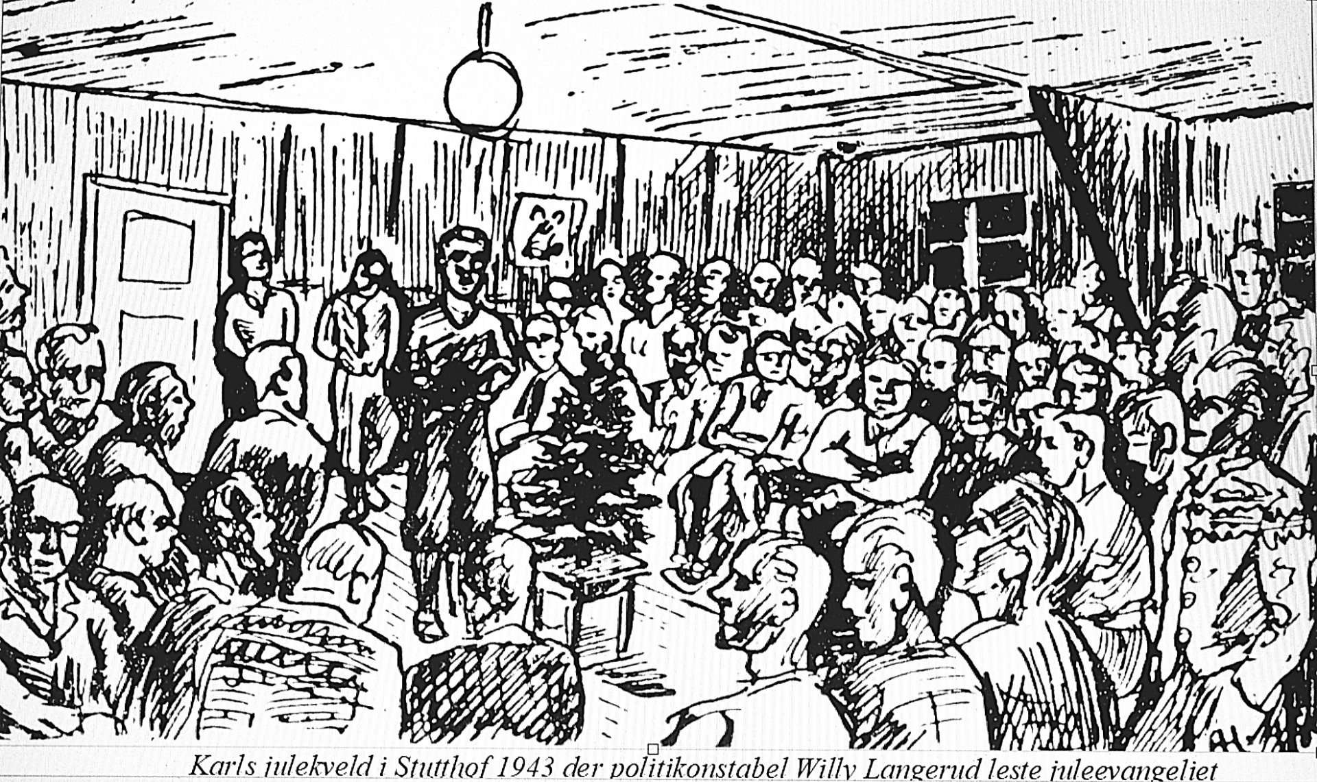 Tegningen viser Karls julekveld i konsentrasjonsleiren Stutthof 1943 der politikonstabel Willy Langerud leste juleevangeliet. Tegnet av Anker A. Hafstad.