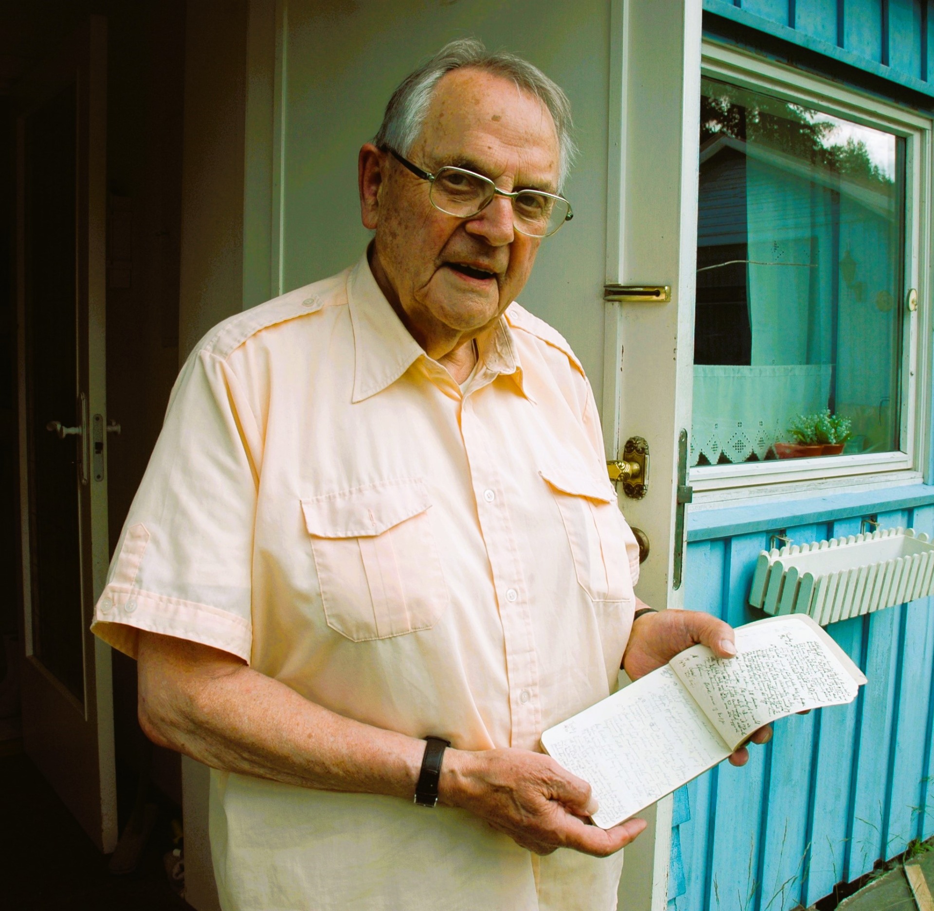 Her er Karl med dagboka han skrev under oppholdet i konsentrasjonsleiren. Den var grunnlaget for boka jeg skrev om livet hans.