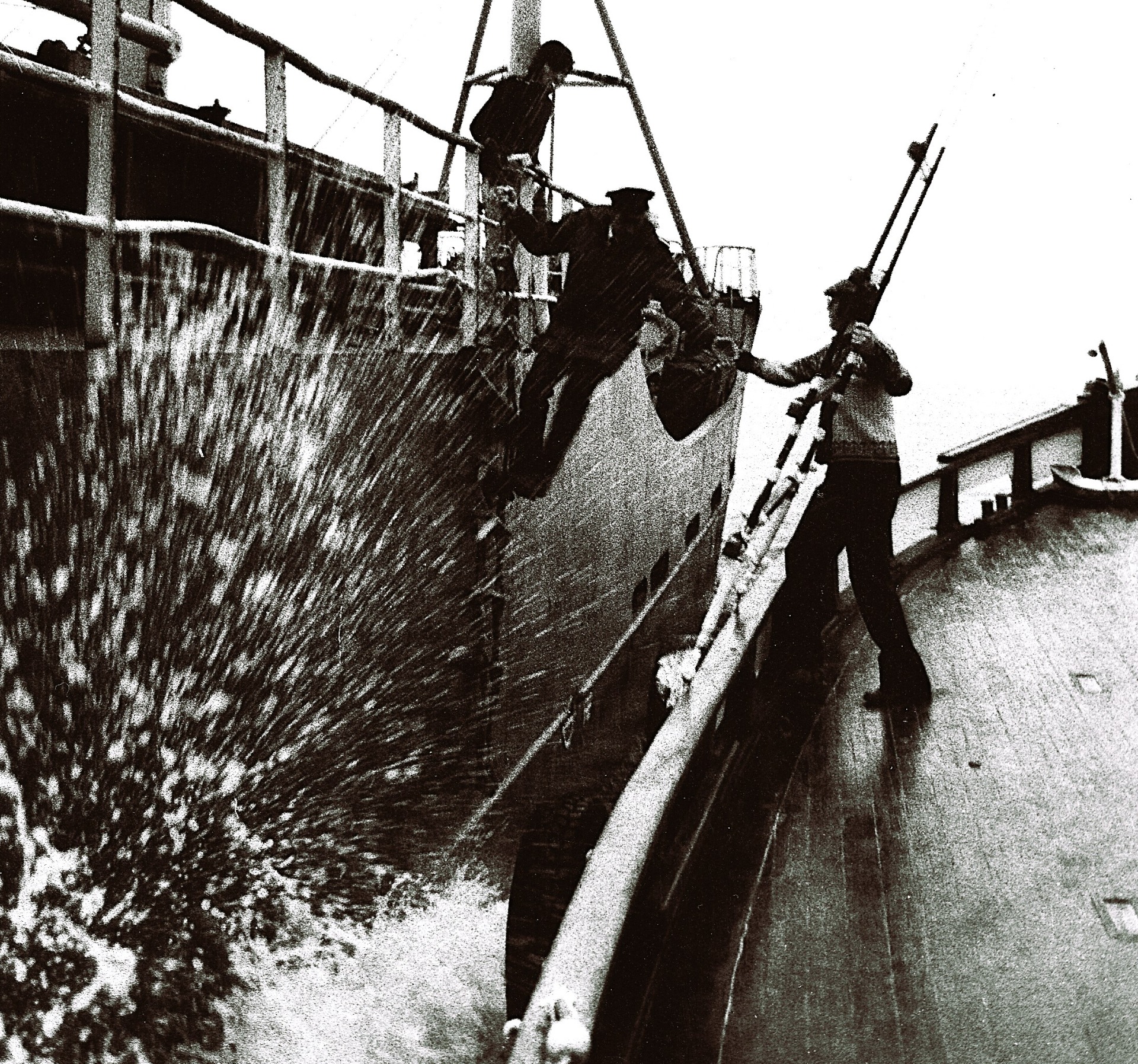 På bildet er det en av losene, som var stasjonert i Stavern, som er i ferd med å entre over i losskøyta igjen etter endt oppdrag. Her var det om å gjøre å holde tunga rett i munnen og hoppe over i akkurat rette øyeblikk – mens skumsprøyten sto opp langs skipssidene.